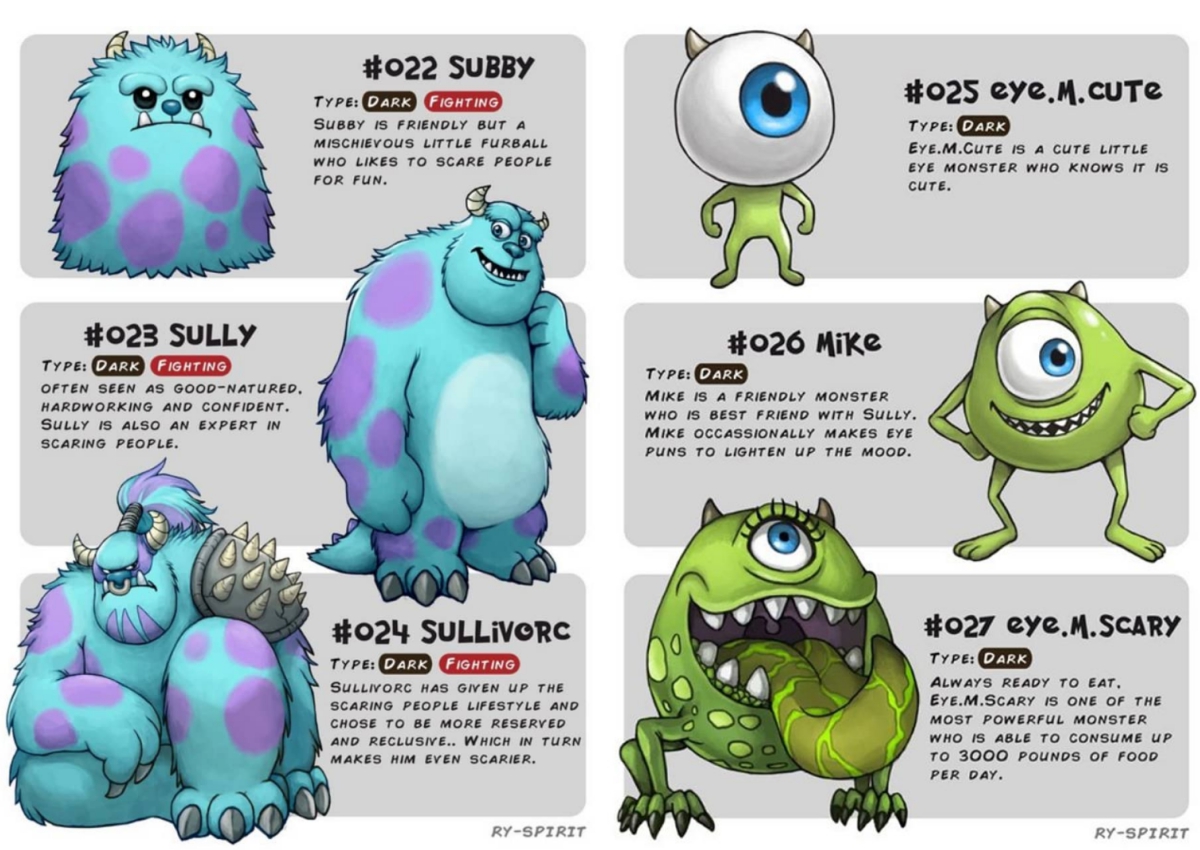 連《怪獸電力公司》都來參一咖啦~蘇利文竟然被歸在暗黑+戰鬥屬性,人家原本明明就憨厚可愛!麥克華斯基的名字很有創意,不過進化款好可怕,真的很SCARY....