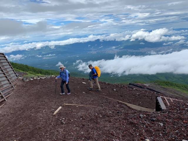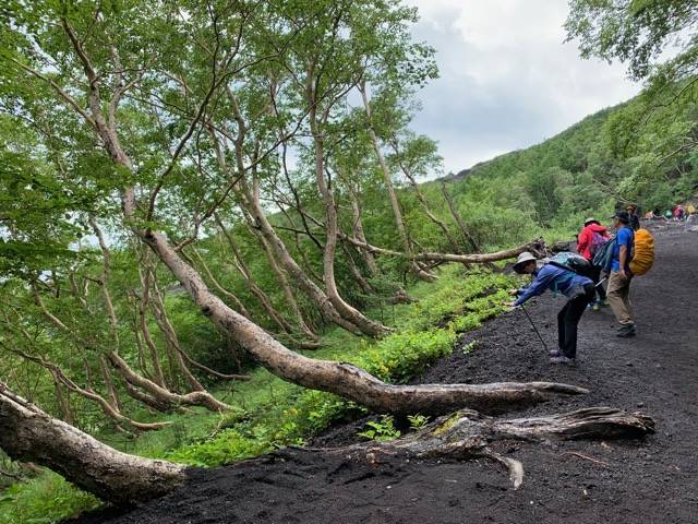 富士山的路主要是火山熔岩,有些路段是會滑的碎石砂路,植被大多是低矮的灌木叢與苔類,幾乎沒有遮陽的大樹。抓地力的不足也導致有落石的危險,小編爬完富士山的2天後,就看到1位登山客被落石擊中的新聞,所以登山時還是要多注意安全呀!(在登山口可以借安全帽)