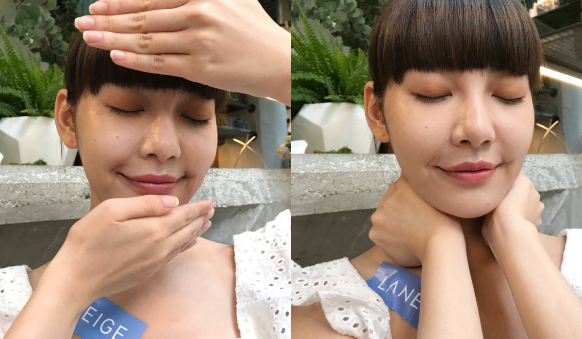額頭及下巴同樣以按壓的方式,讓晚安面膜均勻分布在肌膚上,最後別忘了脖子也要帶到喔!