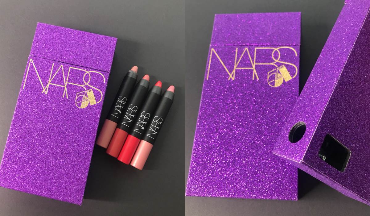 鑲滿細緻亮粉的紫色菸盒包裝,裡面裝有4支NARS熱賣絲絨迷霧唇筆,盒子的底下還貼心設計削筆器,小小一盒外帶出門超方便!