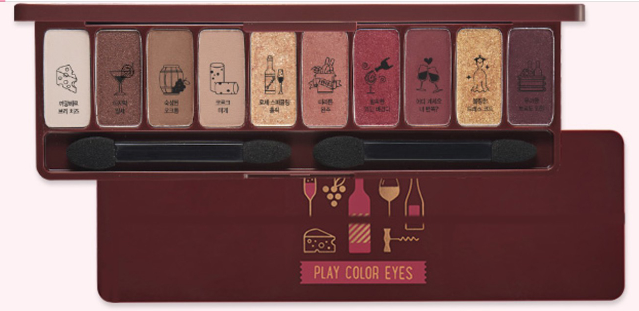 ETUDE HOUSE在秋天推出的波爾多紅酒派對微醺眼彩盤,內含10色眼影,有珠光和粉霧質地。以酒紅色調為主,還有可可色、金棕色、卡其灰、米灰色等,可以用來打亮、打底,也能完成陰影修容,cp值很高。質地也深受好評,抹在眼皮上柔滑好延展,也很顯色,難怪韓妞會這麼愛啦!