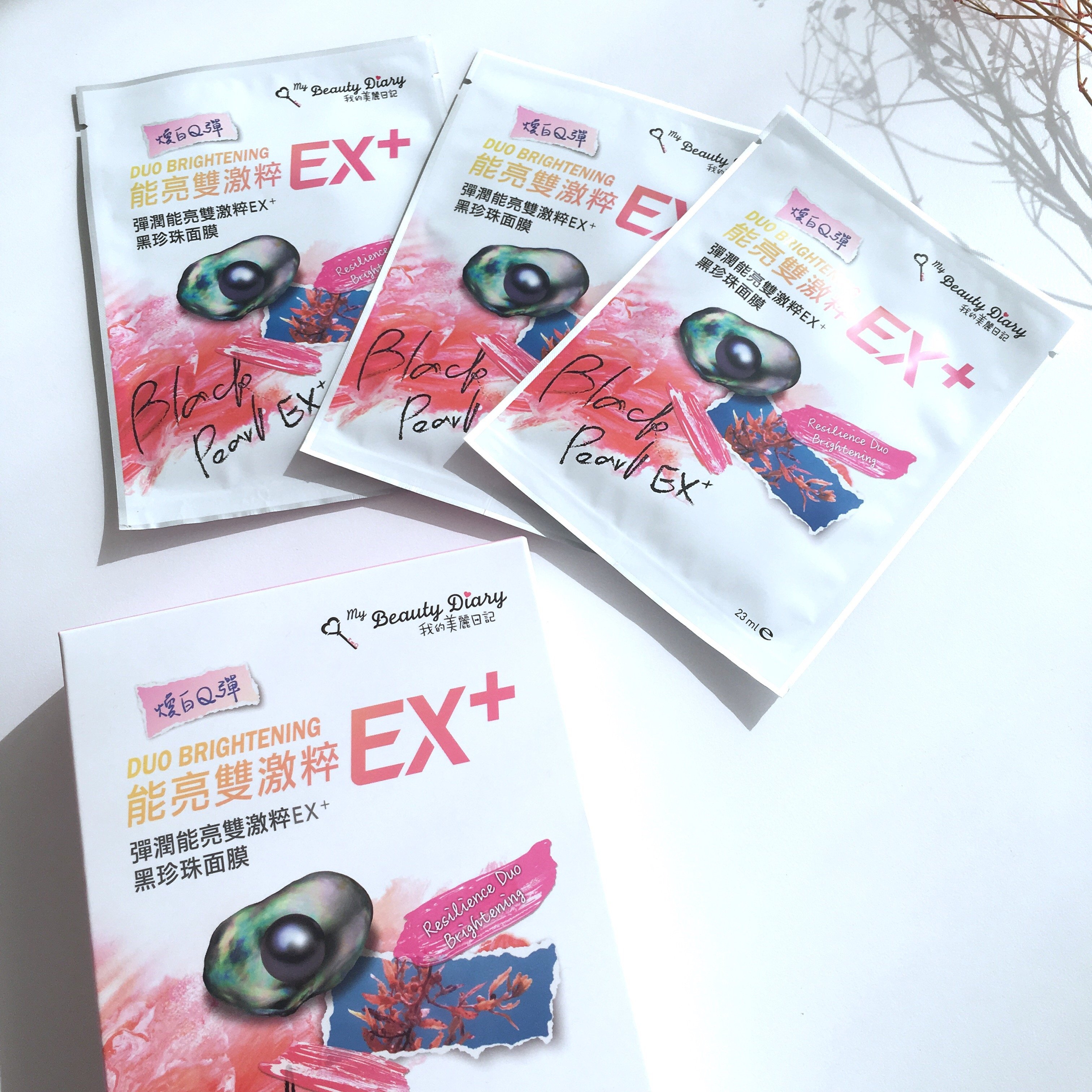 非常受到歡迎的開架面膜品牌我的美麗日記,2018年再度以高規格成分,推出全新「彈潤能亮雙激粹EX+黑珍珠面膜」,精華液中注入源自海洋的生命能量,彈潤精華-南法有機馬尾藻與水解膠原蛋白,搭配美白精華-大溪地黑珍珠精華與熊果素,雙效精華一次達到淨白、彈潤效果,回復健康肌膚的緊緻彈潤,重現Q彈煥白的新生光采,2018/12/26正式販售。