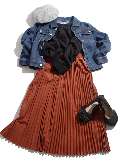 百褶裙的氣質在混搭上牛仔外套的休閒,不會過於甜美也不會過於隨興的搭配展現出上下身的絕佳平衡感。