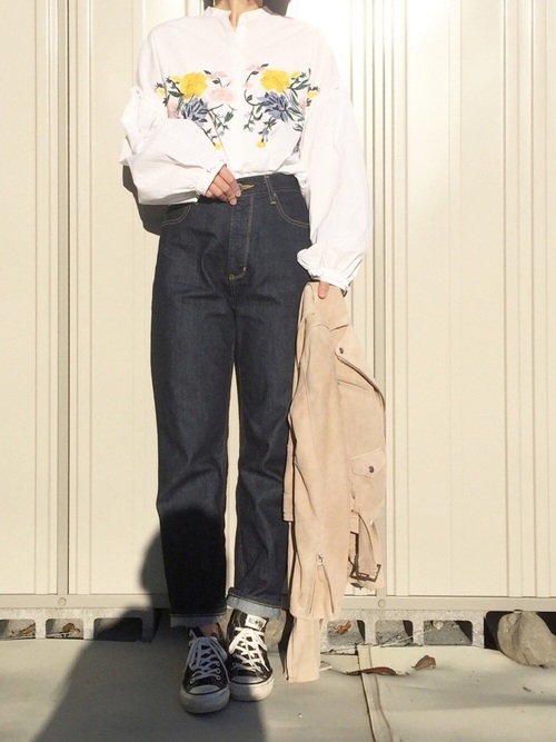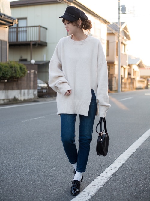 白色毛衣單穿的話覺得略顯無趣?oversize+開衩的設計讓毛衣不單調,且牛仔褲搭配白襪的穿法也可以讓腿部的視覺比例加長喔!
