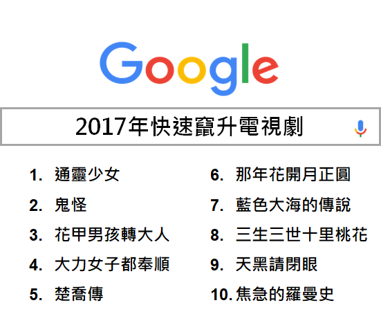 這個月中旬,Google大神公佈了2017年台灣熱搜排行榜(Year in Search),列出了過去一年來,搜尋量快速成長、最獲得台灣人關注的關鍵字。