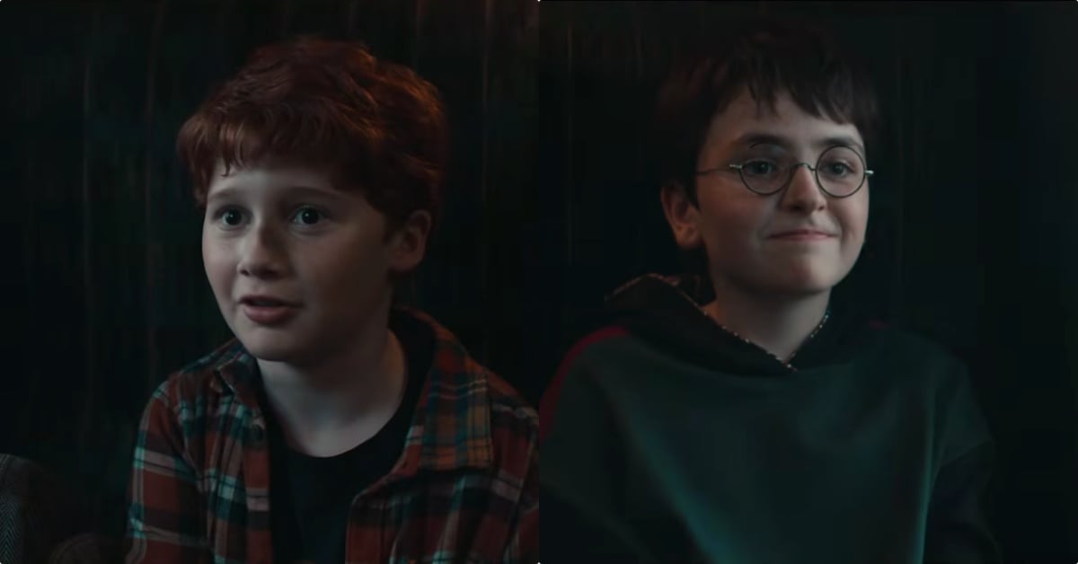 鏡頭一轉,小哈利接到霍格華茲魔法與巫術學院的入學通知信,海格出場帶領他走入魔法世界,在列車上與飾演榮恩的阿利斯泰爾斯陶特(Alastair Stout)、飾演妙麗的阿拉貝拉史坦頓(Arabella Stanton)相識,榮恩詢問:「你是哈利波特嗎?」哈利靦腆承認後,可愛的互動讓人會心一笑~