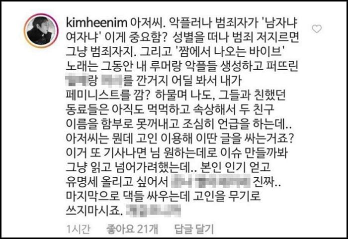在節目播出後,記者「위근우(暫譯:魏根雨)」卻針對希澈的言論不滿發文,不但特別提及去世藝人的名字,更指責:「雖然用留言攻擊不論是男性還是女性都是不對的,但是用性別矛盾中男女都有錯來引導出結論的話不合邏輯」,希澈看到直接留言回擊:「我跟與兩位朋友很熟的同事們,直到現在還是難過到不敢輕易提到故人的名字,大叔你算什麼這樣消費他們?」更指責他根本是為了出名博取關注。之後更在DC Inside平台曬出長文解釋最近針對惡評採取的積極態度。