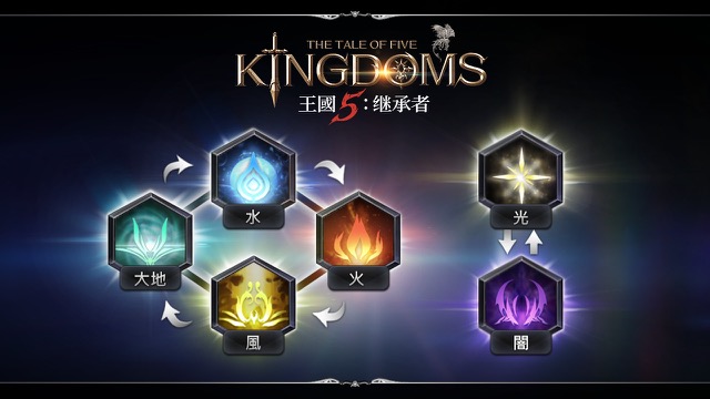 在《王國5:繼承者》的遊戲世界裡,玩家將能隨心所欲在上百位英雄裡組合出各式各樣的5人陣容,而英雄們主要劃分三大職業類型「戰士」、「魔法師」、「獵人」,以及六大屬性「水」、「火」、「風」、「大地」、「光」與「闇」。英雄屬性之間有縝密的對立特性,水剋火、火剋地、地剋風、風剋水,光與闇相剋。