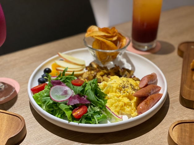 以上六道甜鹹早午餐皆含有「早餐餐盤」(如上圖) ,包含鮮脆時蔬沙拉、季節限定水果、滑嫩炒蛋、德國香腸、培根鹹香炒菇和鮮炸薯片等!