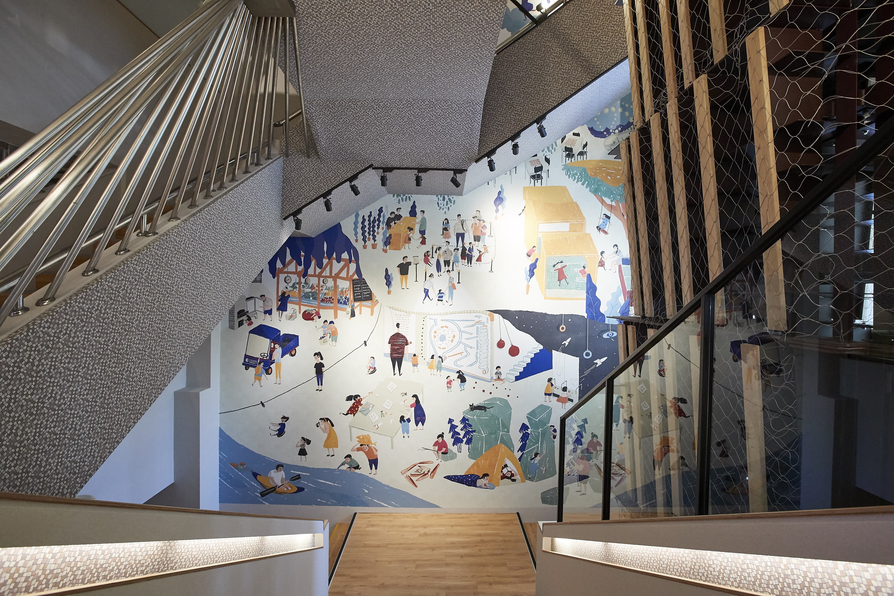 博物館的二樓就是屬於比較開放式的空間。美術塗鴉區能讓孩子們隨性地揮灑自己的創意,除了可以在紙上畫水彩畫,連大片玻璃也都是孩子們可以水彩塗塗抹抹的地方喔!