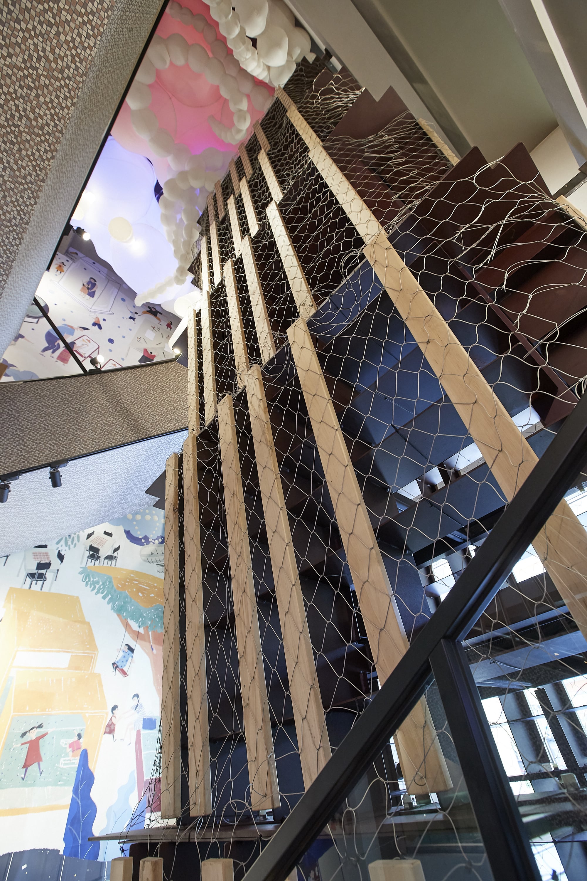 走進這棟建築物,便不得不提到超醒目的「攀爬架」啦~像101大樓般的中空柱子,裡面有一格一格的平台,高達三層樓的高度能讓孩子滿足自己的冒險精神。