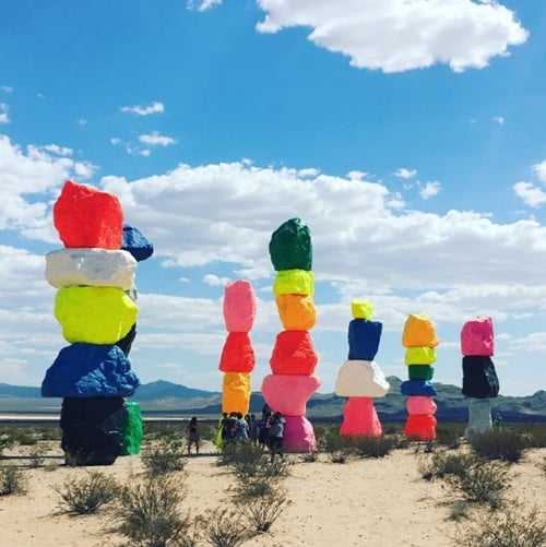 其實這群七彩巨石陣的正式名稱為「Seven Magic Mountains」(暫譯:七彩魔法山),是由一位瑞士藝術家Ugo Rondinone建造的大型戶外裝置藝術,於今年五月才正式完工,而且將在美國拉斯維加斯沙漠區公開展出長達兩年之久。(或許我們都有機會到現場一睹它的風采!)