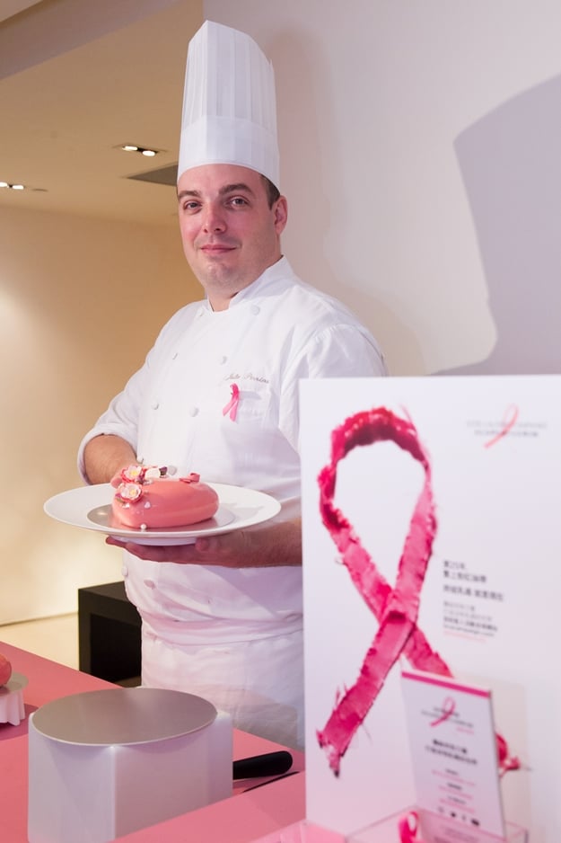 為支持雅詩蘭黛集團粉紅絲帶25周年,自10月1日起至31日止台北君悅酒店加映推出「點粉紅送愛心」活動,於館內指定餐廳點用粉紅限定餐點,將提撥餐點總收益之百分之二十捐贈予財團法人台灣癌症臨床研究發展基金會,你我同心,展現美麗的力量。指定餐廳包含Baguette禮品‧烘焙坊、Cheers歡飲廊與ZigaZaga義大利餐廳,粉紅限定餐點為Baguette 禮品‧烘焙坊推出的「柔情絲緞」慕斯蛋糕,由法籍甜點主廚博豊安親自設計,以象徵女性溫和與柔軟的粉色愛心為造型,以香甜的蜜桃覆盆子慕斯溫柔包裹蜜桃果醬與開心果費南雪,加入玫瑰甘納許增添味蕾層次,外層淋上蜜桃與覆盆子特製的粉紅鏡面,蛋糕上的牡丹裝飾,由甜點主廚以一片片巧克力花瓣手工組成,每朵費時15分鐘製成,博豊安主廚表示:「女性如同牡丹般美麗雍容、嬌豔綻放,但需要細心呵護與關懷,才能保持最佳姿態,以粉紅、花朵、愛心三個象徵女性的元素設計這款蛋糕,品嘗美味甜點之餘,也能一起響應粉紅絲帶活動,並關愛每位女性的健康。」