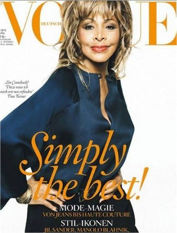 雖然大家都曉得時尚圈喜新厭舊的程度有多迅速,不過有些經典是不論新秀如何冒都還是能穩坐江山無法取代的。向來偏好以年輕女模或時下當紅時尚名人作為封面人物的德國版《VOGUE》雜誌,在最新一期的四月份《VOGUE》雜誌有了新突破!編輯團隊請來50年代中期經典搖滾歌手蒂娜特納Tina Turner擔任封面女郎。1939年11月26日出生的蒂娜特納Tina Turner,今年已高齡73歲卻是第一次登上《VOGUE》封面,這次身穿好友Giorgio Armani所設計的藍色素面禮服,優雅詮釋出成熟女人由內散發的「極簡完美Simply the Best」。這也是全球《VOGUE》雜誌繼去年一月號美國版請到62歲的梅莉史翠普Meryl Streep後,目前年齡最高的VOGUE封面女郎。