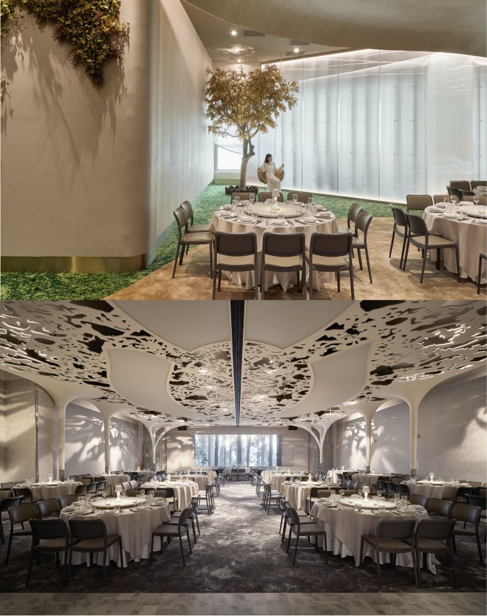 surReal系列的「大地」空間以真實的山林大樹妝點(上圖),surReal系列的「光影」空間天花板為雷射雕刻,創造動態剪影(下圖)。(圖片提供:典華幸福機構)