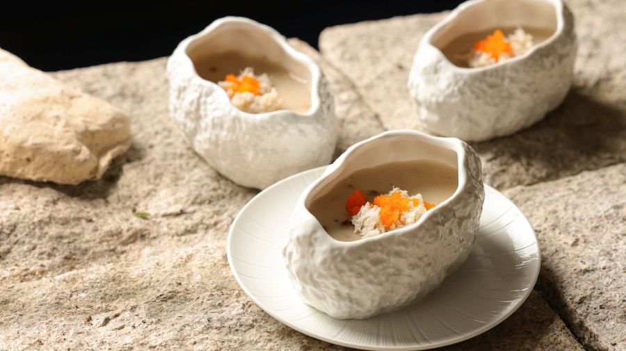典華此次不僅推出全新空間,更將周邊餐食、器皿甚至14間VIP休息室一併升級!混血侘寂風格的VIP休息室使用舒適柔和的色彩,添加綠色植栽,選用暖色調皮革沙發,讓賓客沉浸療癒氛圍。主廚團隊延續空間的自然生命力,將宴客餐食創新,無論是眼觀、食用或觸感皆讓人有嶄新體驗。餐具大膽挑選業界獨有的動態波紋杯及手感溫潤刀叉,大幅提升品味及高級感;餐食由9月榮獲2024年新加坡國際美食大賽的典華金牌主廚團隊結合「大自然」與「美味」,每樣菜色皆可看見如陽光、花草、雲朵等自然元素。