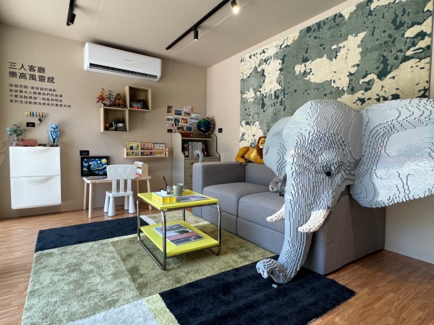 第一間「三人客廳」屋主設定為喜歡旅遊的一家人,用31287顆積木拼成「動物大遷徙」,並藉由「21332地球儀」、「21347 倫敦紅色電話亭」、「10298偉士牌125」等盒組,將居家客廳中的擺飾添加樂高元素,為生活拼砌出旅遊回憶,在家中就能環遊世界,只要加點樂高就能拼砌出家庭的生活軌跡與成長的異想天地!