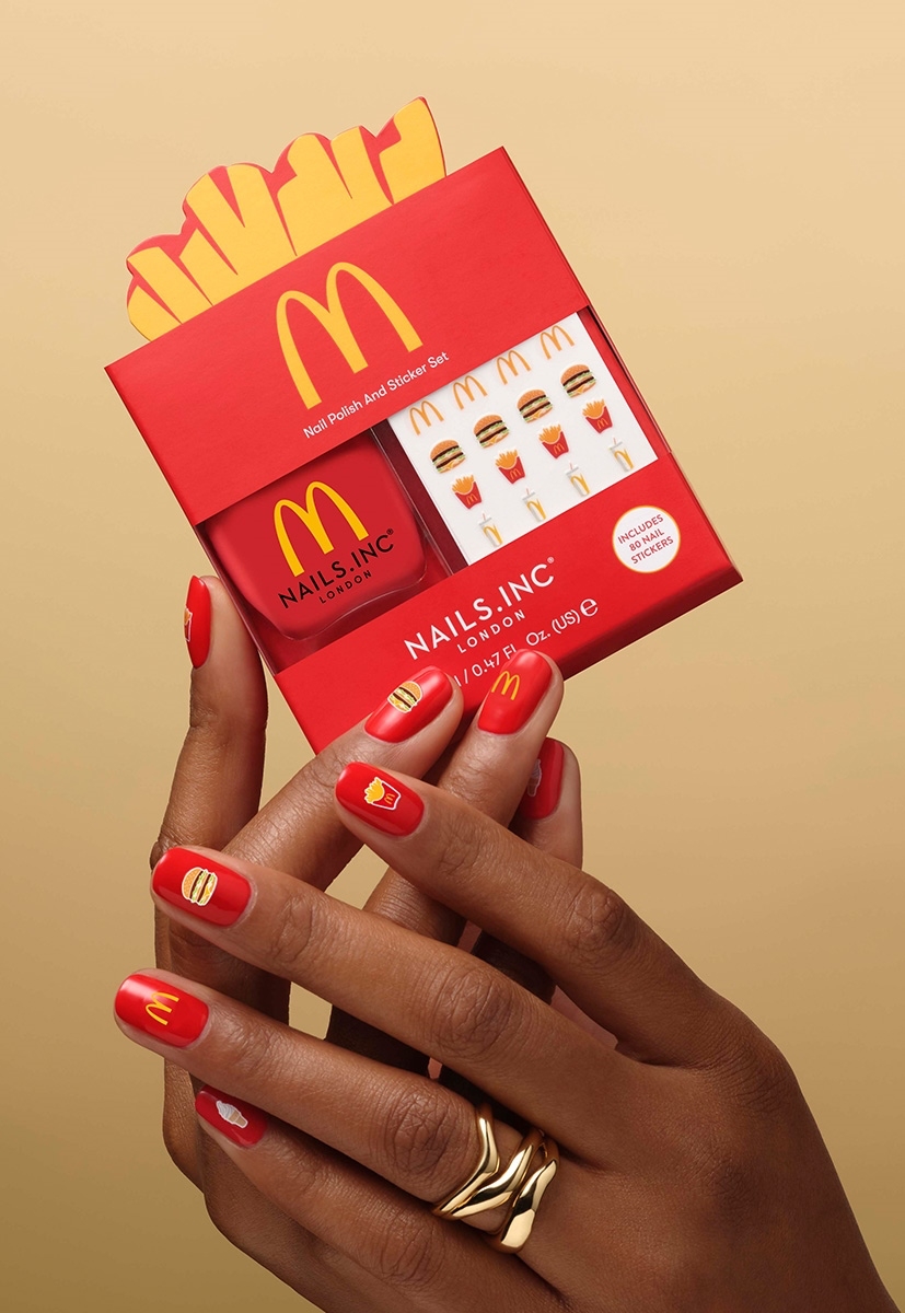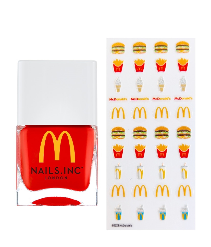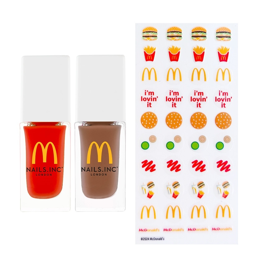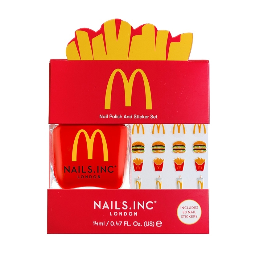 BA DA BA BA BA I'm loving it! 熟悉的廣告旋律,經典的紅底、黃字母M標誌,大小朋友都喜愛的全球連鎖速食店麥當勞,永遠的1號餐大麥克、薯條一定要沾番茄醬,現在不僅能吃,還可以擦上指尖自由配專屬套餐!麥當勞近期跨界和英國指甲油品牌Nails Inc聯名,推出限定版指甲油,麥粉趕快收藏!
