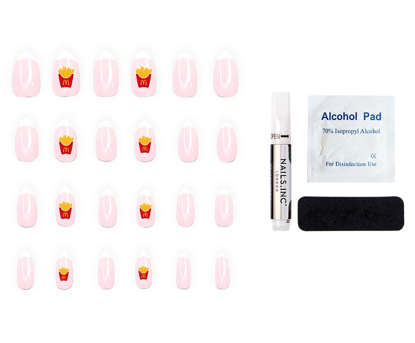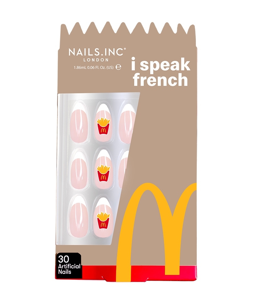 今天想來點法式風?這次的聯名除了指甲油外,還推出美甲貼!包裝以麥當勞經典的棕色紙袋為靈感,指甲則以百搭實用的杏粉色為基底,上面還印有麥當勞的人氣小點薯條,只要使用內附的凝膠就能快速貼上指尖。