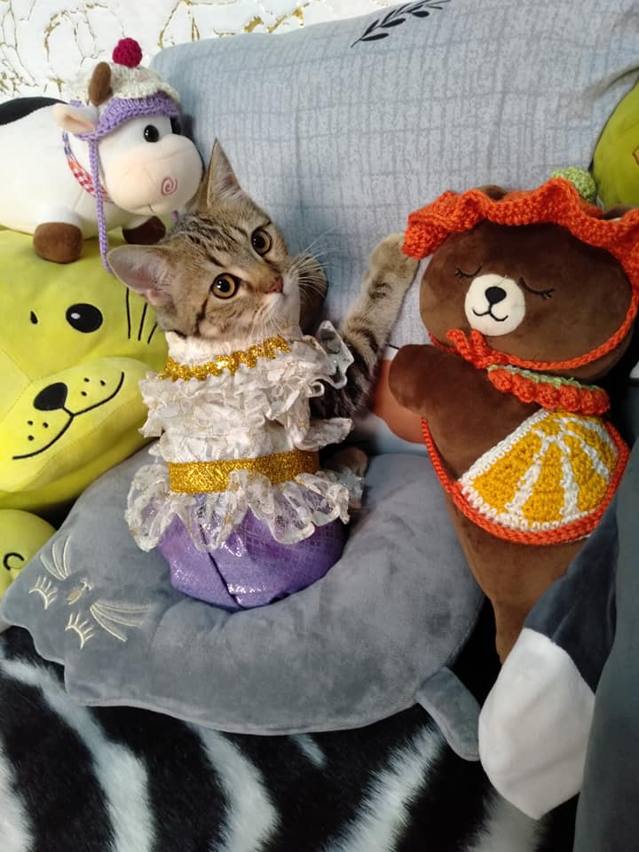 Bong Bong可不是只有賣菜郎的模樣,牠其實還會打扮成小公主呢,像是:洋裝、帽子、眼鏡、圍兜兜、蕾絲蓬蓬裙&項鍊等配件,牠可是一樣都沒少,身為飼主心肝寶貝的牠,擁有一整個衣櫥也不為過啦!(延伸:「泰國胖橘貓」美人魚尾穿上神似金魚)