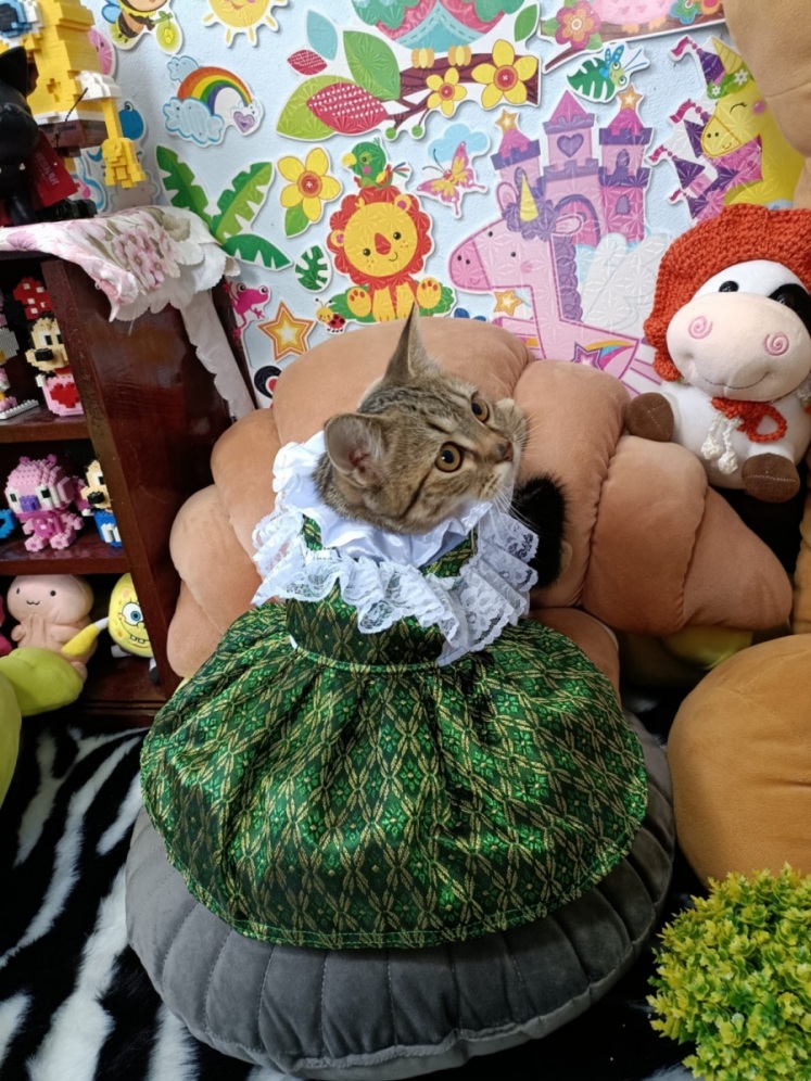 泰國當地有一隻名叫Bong Bong的小貓,擁有一對水汪汪的大眼睛+櫻桃小嘴,身上的虎斑花紋讓牠看起來像是小老虎般俏皮;牠個性活潑乖巧,面對飼主幫牠穿上的各種服飾也不會掙扎或不悅,根本是天使貓貓來著!