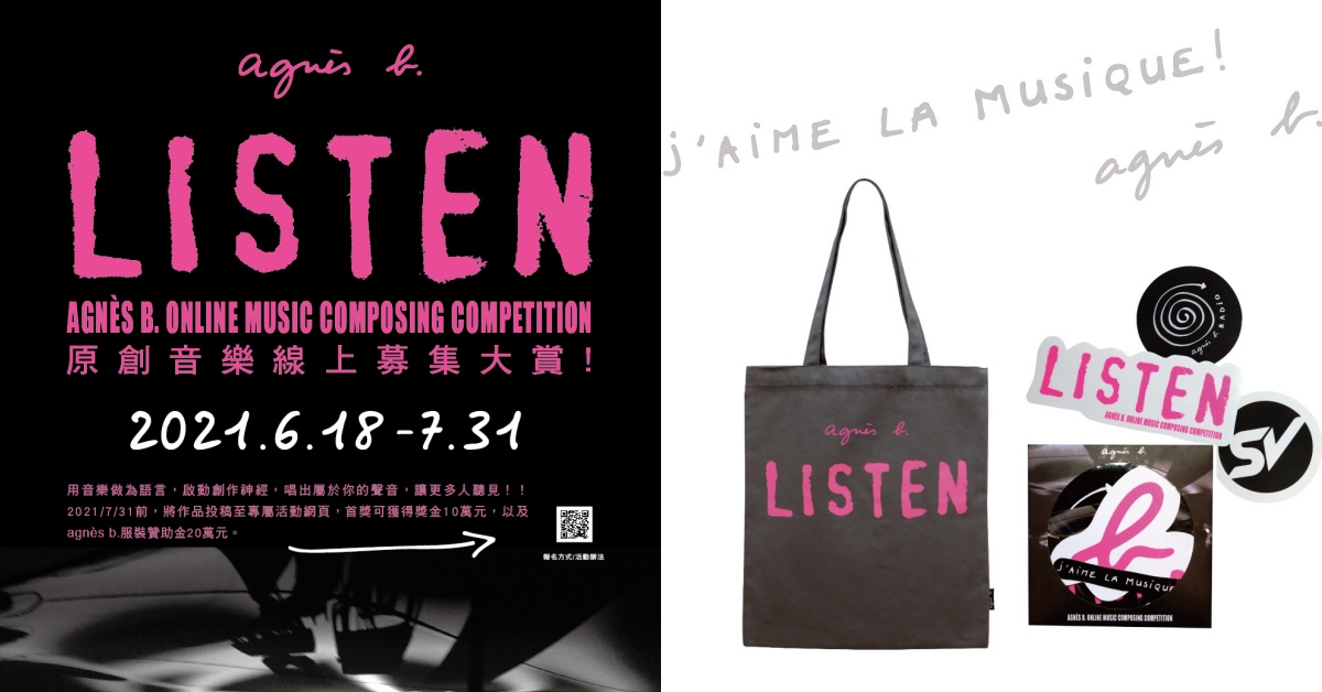 活動特別邀請資深音樂人馬念先與街聲音樂總監小樹擔為展現全力支持年輕音樂人的決心,與更多人一起交流音樂的美好。agnès b.於2021年夏季舉辦LISTEN!原創音樂線上募集大賞。全民防疫期間,與最潮的原創音樂社群平台StreetVoice合作,採用線上徵選方式,邀請新世代創作者參與,以獨立原創音樂進行投稿,將美妙動人的旋律及才華傳遞給大眾。任大賞評審,StreetVoice會員於投票期間也可線上投票支持喜愛的歌曲創作。凡參賽即可得到LISTEN限量商品(數量有限贈完為止);首獎更可獲得agnès b.服裝贊助及現金獎等總價值30萬元獎項,並有機會站上舞台公開表演。