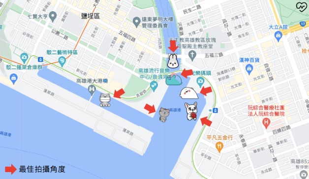 除了白天之外,每天晚上19點至23點,維持四個小時的時間還會亮燈,妞編輯推薦三大拍照點,分別為「高雄流行音樂中心」愛河灣水域對面,也可以搭輕軌到「光榮碼頭」、「真愛碼頭」找他們玩,也貼心提醒大家到現場打卡時,一定要記得防曬和補充水分!