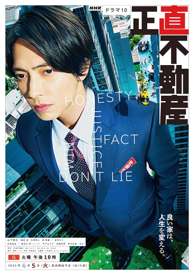 《正直不動產》改編自同名漫畫,由山下智久主演,福原遙、泉里香、市原隼人、倉科加奈共演,講述能言善道、業績第一的不動產銷售員永瀬財地,某天因為土地的詛咒變得無法說謊,只剩下「正直」這項武器,能否在不動產界生存下去呢?