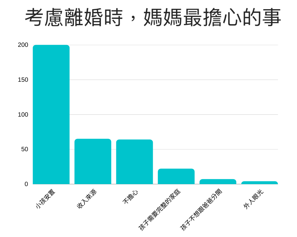 根據媽媽妞真心話私密社團的調查中也發現,許多媽媽在面對離婚時,擔心的都是自己的經濟收入來源:多年沒有外出工作、如何保持競爭力、自己出門上班了小孩又要交給誰照顧?保母、托嬰、幼兒園又會是另一筆支出開銷。
