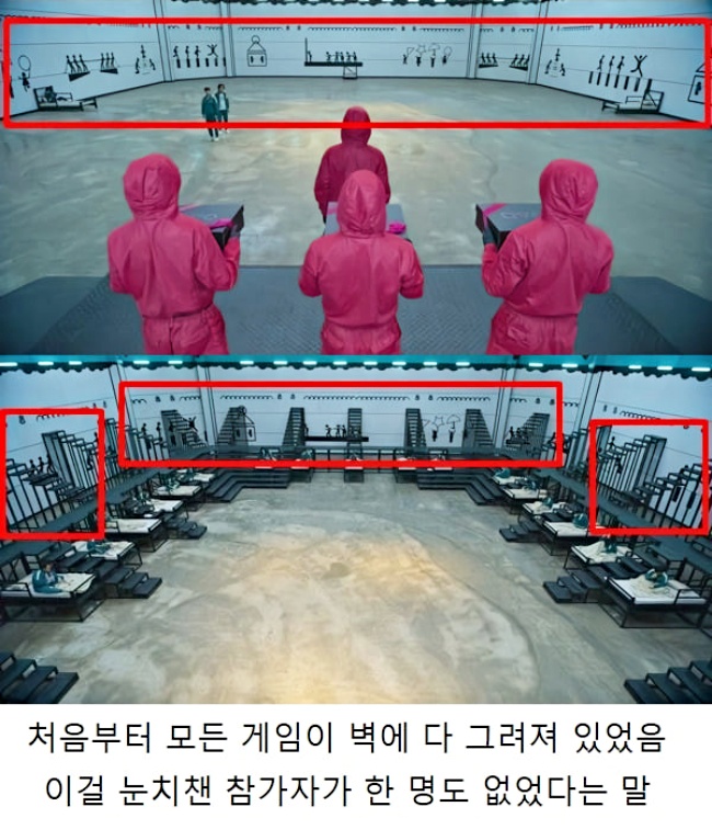 有網友發現「其實在第一關卡前遊戲官方就給了提示」!?(驚),在第一集工作人員們統一把456玩家集中在一個密閉房間中,裡面只擺放了疊成階梯形式的單人床,當時只顧著擔心害怕的玩家們完全沒心思注意到…原來牆壁上已經畫好了各關卡的遊戲主題!!!
