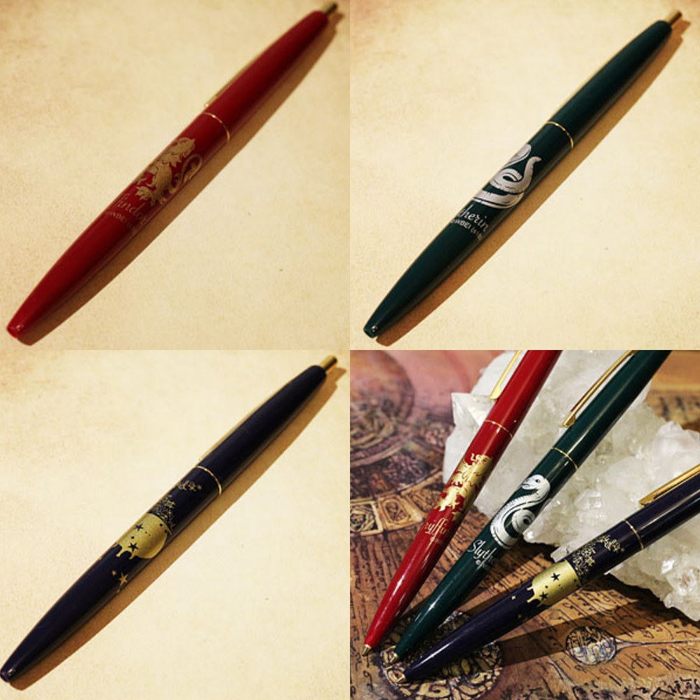 最後看似最普通是原子筆系列,雖然筆實在算是頗無趣的周邊,但這款選用的小圖案卻很可愛、特別分別有葛來分多與史萊哲林兩大學院與魔藥大釜款,圖案相當精緻加上用金銀兩色勾勒出的字體實在是太美了吧!