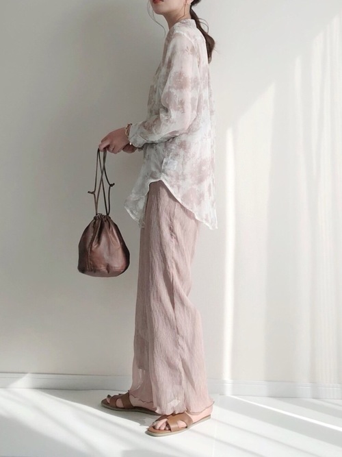 粉紅色穿搭一般都給人甜美風的印象,但只要單品選得對也能穿得成熟穩重,像是棉麻材質的藕粉落地褲搭配刷染透膚襯衫,不刻意地將下襬紮進褲頭,而是讓原本倒V的剪裁去修飾臀型,慵懶又帶點個人特色!