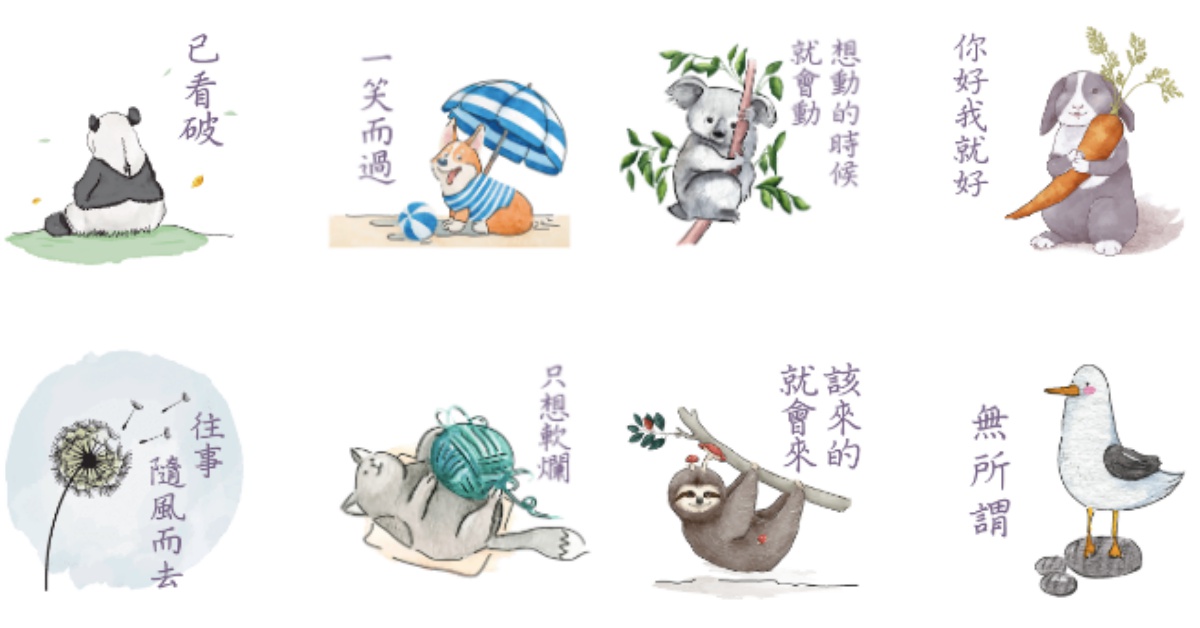 不管是背對著的熊貓一付「已看破」的淡然模樣,還是比起別人都更慢動作的樹懶,微笑放空著地表示「該來的就會來」,都讓人看了也跟著平靜了下來。(?)