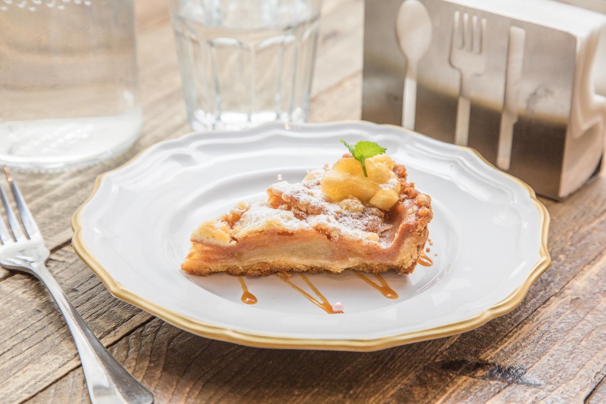 首先是裡面的蘋果用了萊姆酒熬煮過,再連同熬煮蘋果產生的糖漿一起加入塔皮裡,內餡是用片狀的蘋果,塔上再綴上切成小塊的蘋果丁,營造兩種截然不同的口感。