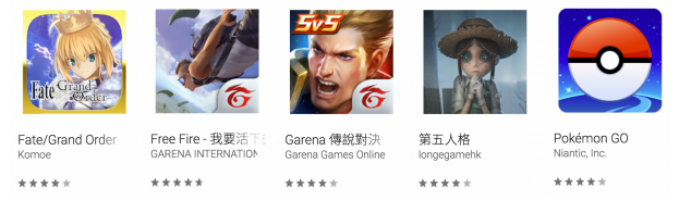 在今年的遊戲榜單中,Google Play特別開放用戶票選「最受歡迎遊戲」,入選的遊戲為角色扮演遊戲《Fate/Grand Order》、《第五人格》、策略遊戲《傳說對決》、俗稱「吃雞」的逃殺生存手遊《Free Fire - 我要活下去「天堂再臨」》以及抓寶手遊《Pokémon GO》。