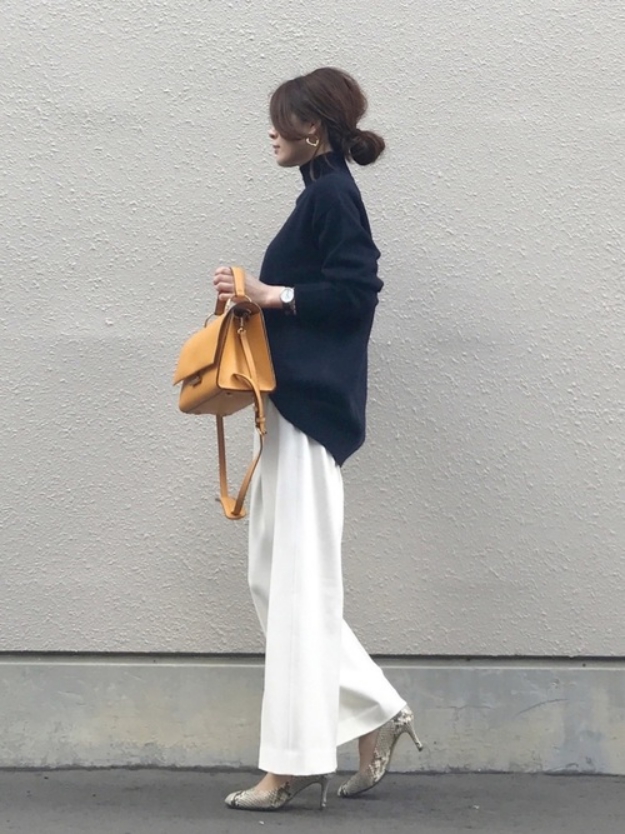 如果全身只有黑白兩個顏色怕太單調的話,就利用配件來畫龍點睛!銀色的耳環和黃色的包包就變成了今日穿搭亮點!