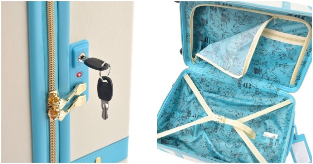 行李箱以海洋藍為主色,隨附行李吊牌,內裡是滿滿的愛麗兒。另外,拉鍊處還相當可愛地以「叉子」為吊飾。有看過《小美人魚》的妞妞們應該都記得,愛麗兒曾用「叉子」梳頭髮吧?叉子可說是故事的經典元素之一,拉鍊如此設計,讓人看了就秒想起收看動畫的回憶呢!
