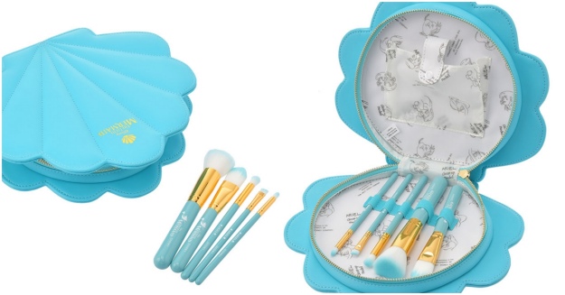 貝殼造型的刷具收納包根本秒勾起少女心!(眼冒愛心)主色是夢幻的湖水綠,裡面隨附五支刷具,分別是粉底刷、眉刷、腮紅刷與眼影刷,另外還有一格小收納袋可以放隨身鏡。