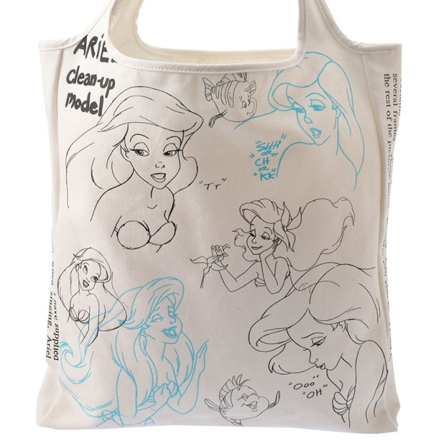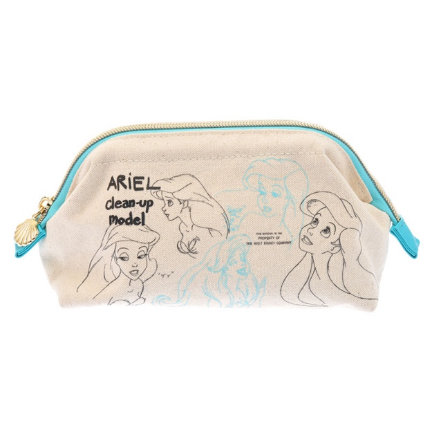 收納包部分,有帆布袋跟化妝包可以選。圖案印上了愛麗兒的線稿,雖然風格簡約但卻不失特別感哦!而化妝包的拉鍊則加上了貝殼裝飾,每一個細節都有《小美人魚》的故事元素。