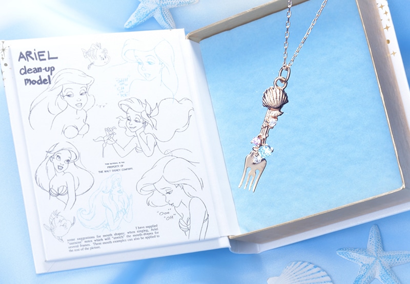 精美的貝殼叉子項鍊,用了「故事書」造型收納盒裝著。盒內印上了愛麗兒的各種模樣,購入之後絕對捨不得丟♡(p.s.這款商品只在迪士尼商店官網販售哦!)