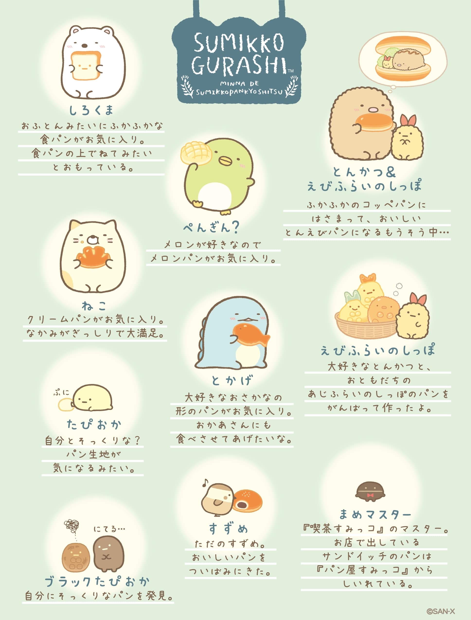 說完了相遇的故事,裡面的人物介紹也相當細心。每個角落生物們都做出了自己喜歡的麵包,炸豬排想跟炸蝦尾一起躲在麵包裡面發呆、炸蝦尾則用麵包做出了炸物全家福(?)、黑珍珠的作品跟自己一樣彆扭,真的是太可愛了!