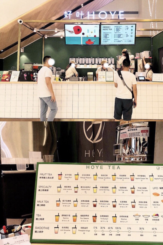這間飲料店叫做「好叶HOYE」,位在深圳九方購物中心的地下一樓手扶梯旁,店面裝潢簡約又不失大方,給人相當清新的感受。據說是六個台灣的年輕人到深圳當地去開創的店,飲品選擇相當多元,從水果茶、奶茶到冰沙樣樣都有!其中人氣最高的飲品種類是「鮮果撞上高山茶」,幾乎是人人必點。