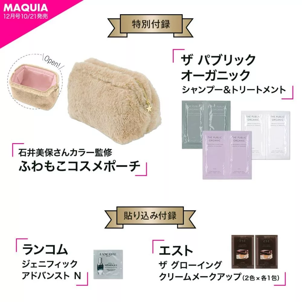 《MAQUIA》附贈的真的是每位女孩都極為需要的「化妝包」,而且配合冬季的意象,這款化妝包採用觸感柔軟的毛茸茸材質,真的很值得入手啊~另外,本期雜誌還附上3種不同功效的THE PUBLIC ORGANIC洗護髮試用組,CP值好像有點高啊!