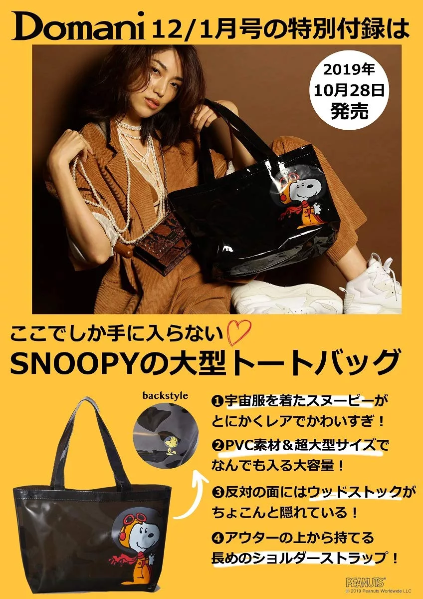 《Domani》雖然比較定位在成熟女性,但附贈的商品卻走爆!炸!可!愛!的路線。《Domani》12月號的贈品正是超夯的「SNOOPY托特包」,包包的正面是SNOOPY裝扮成NASA太空人的Q萌模樣,實在太生火啦~不管是肩揹還是手提都很OK,而且包包的大小剛好可以放入A4紙張,揹去上班也沒問題!