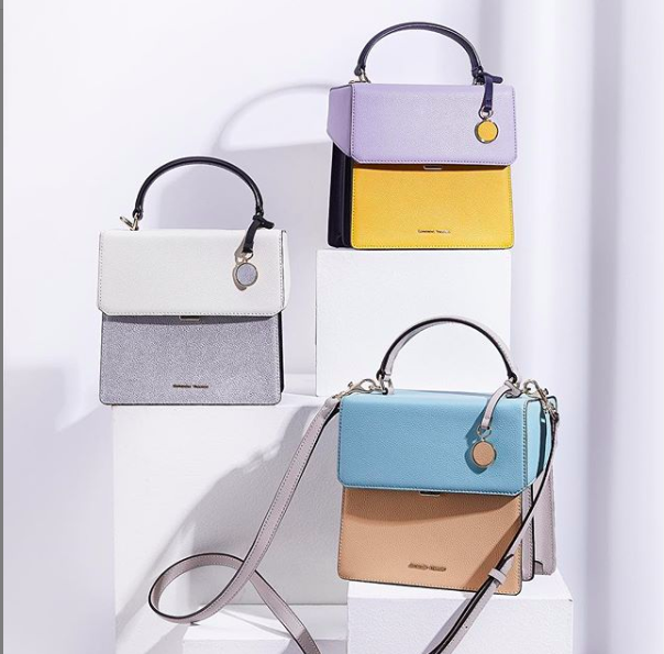 PICNIC系列「撞色盒子包」以冰淇淋般繽紛色彩結合硬挺的復古方形公事包型,仔細一看,還有太陽般的圓型掛飾呢!
