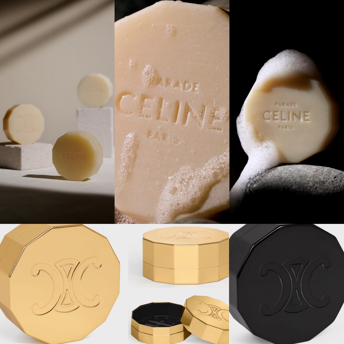 繼香水、香氛蠟燭後,CELINE今年再擴充推出「沐浴與身體護理」系列,香氛皂就是此系列首款品項。每一款CELINE香氛皂均由法國普羅旺斯皂藝師精心製作而成。香氛皂的設計與香水瓶的瓶蓋頂部相呼應,將品牌的「TRIOMPHE」標誌刻在皂體正面,而香調的名稱則刻在背面。優雅的粉香調性,氣味馥郁,除了沐浴清潔之外,同時也可以「乾用」:將它們放在衣櫥或抽屜中,能為織物增添柔和的氣韻;而置於小空間則能讓迷人香氣蔓延。如果想要旅行攜帶,也有推出專屬的香皂盒,金色跟黑色兩款,能夠保護香皂,或是擺飾在浴室,展現個人的生活品味。