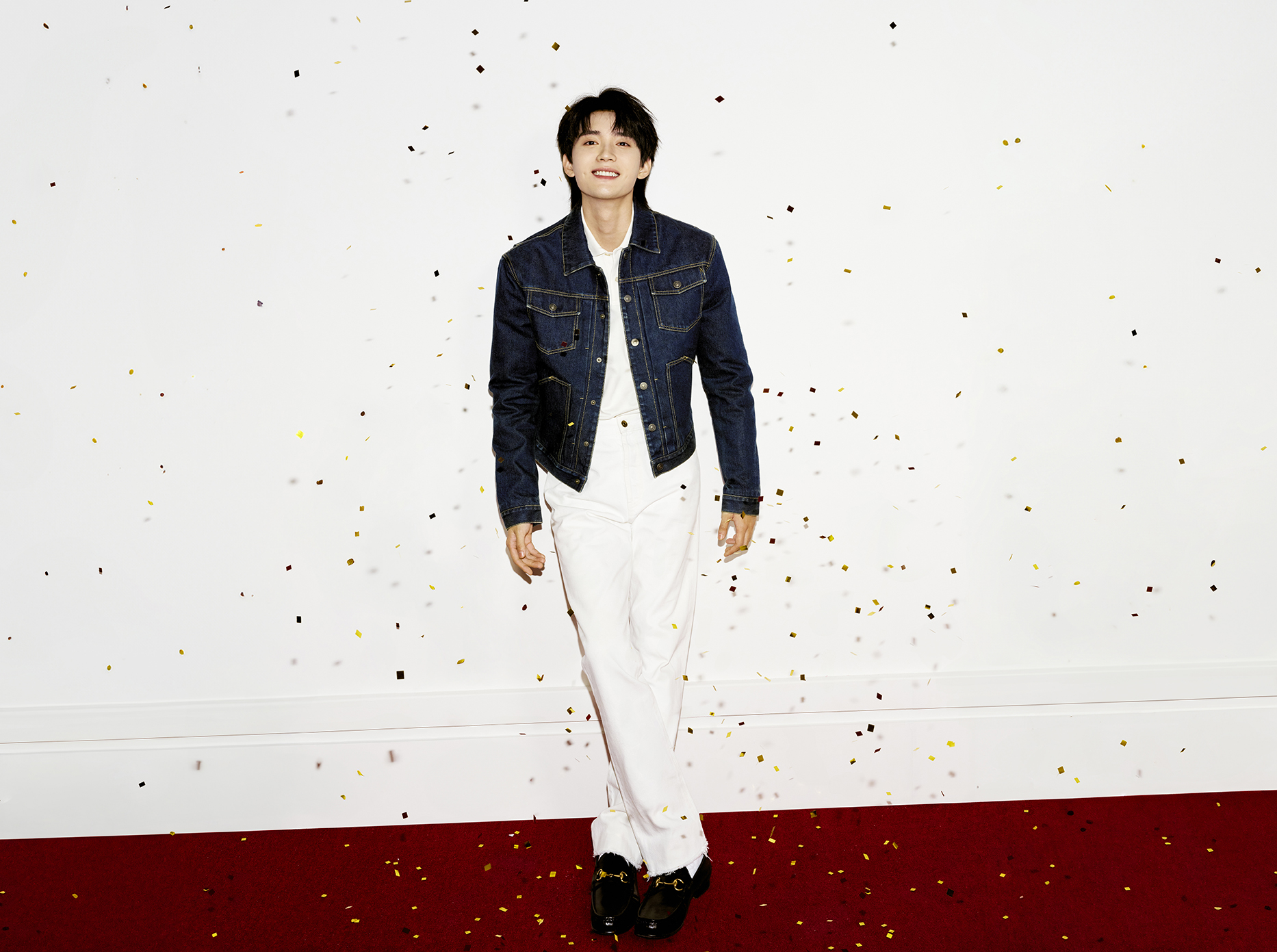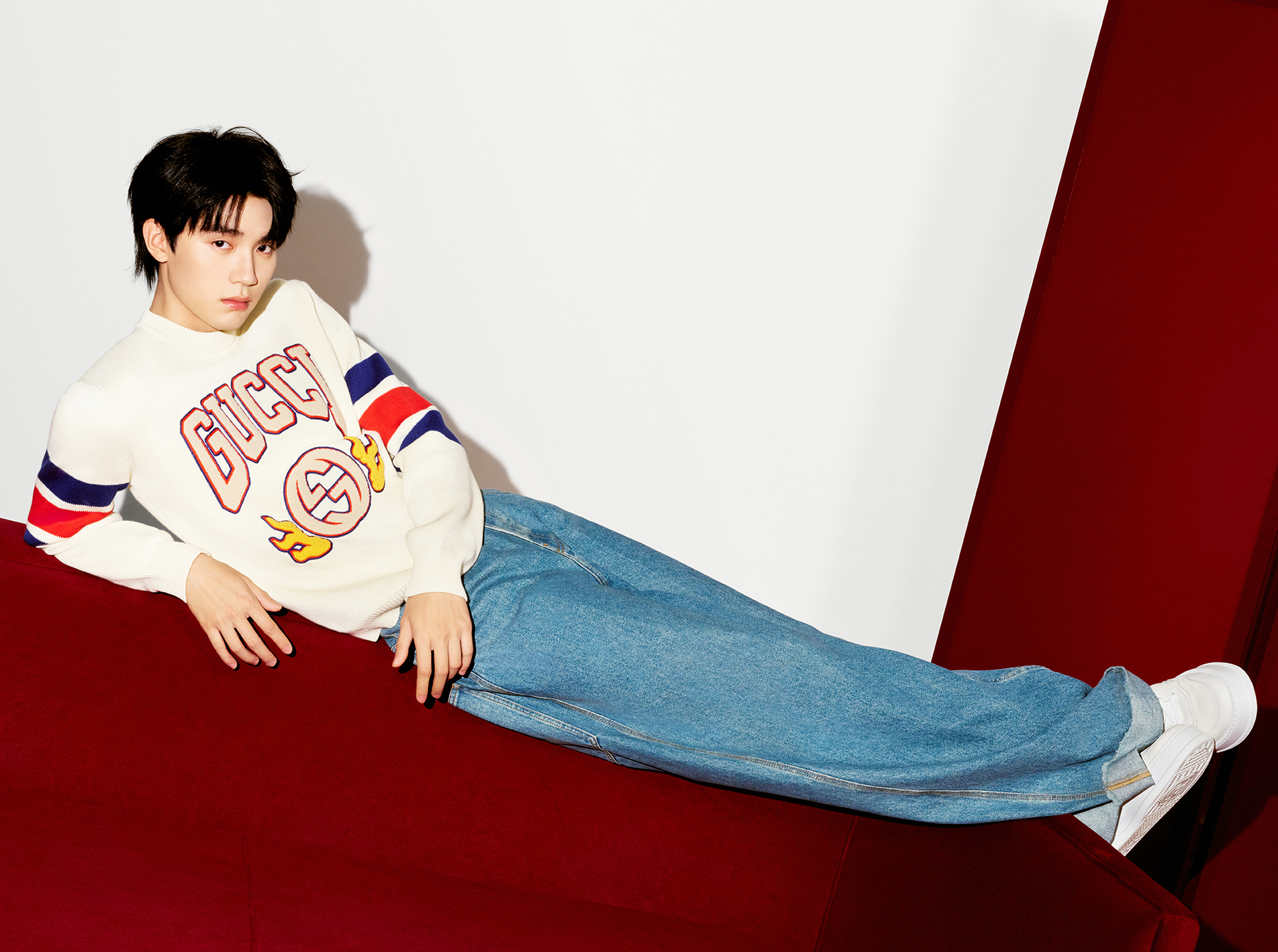 GUCCI龍年限定系列男士服裝以簡約、帶有設計巧思的單品輕鬆完勝。一件基本款的寬鬆上衣永遠不過時,這款刺繡棉質毛衣綴有Gucci Interlocking G翅膀刺繡象徵龍年意象,衣袖處注入藍紅色織帶嵌花飾邊營造層次感,下身以休閒的刷色牛仔褲和同系列白色厚底鞋搭配,簡單又不失禮節,完成人見人愛的鄰家男孩穿搭。