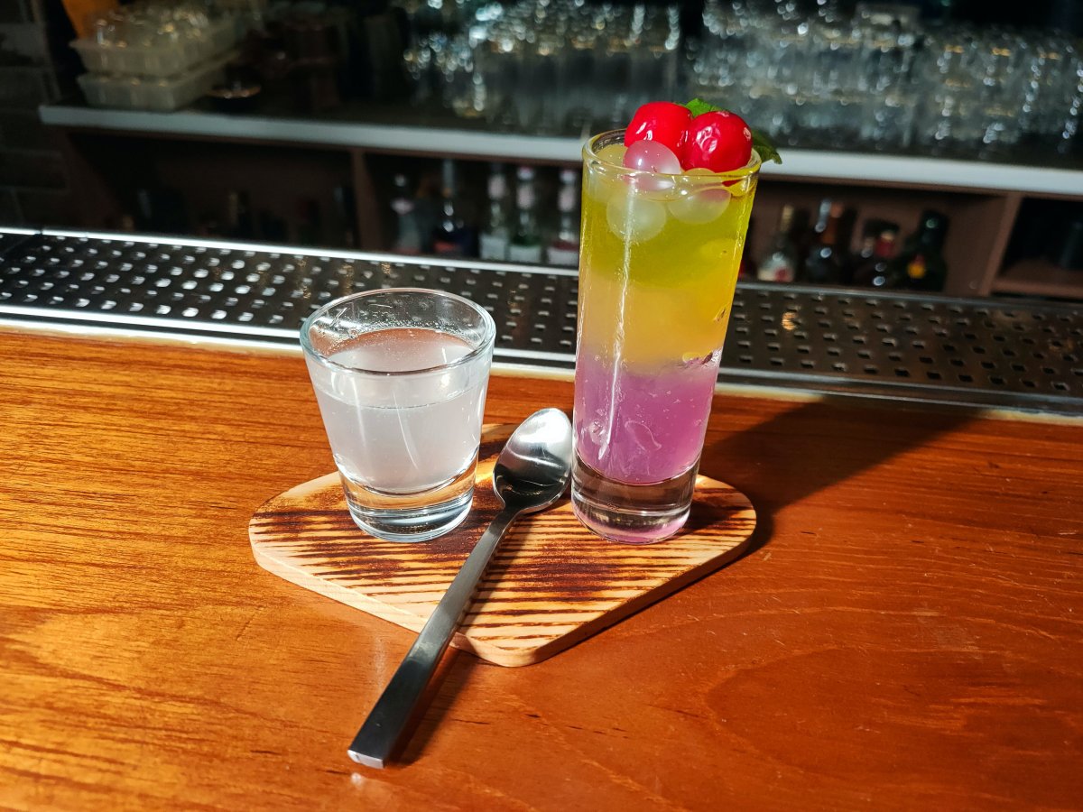 這杯「Symphony 交響曲」超級繽紛可愛,起初是為一個想要在酒吧裡吃點甜的的音樂系客人所設計~紫色是蝶豆花的琴酒、黃色是柳橙柑橘口味的Tequila 、最後綠色的是百香果的Vodka,一個Shot可以喝到三個味道!最上層的是荔枝的果汁球和小紅莓,整體搭在一起吃酸酸甜甜的,就像是一杯「甜點調酒」~吃點果凍再配上一杯香檸蜜蘇打水,利用二氧化碳氣泡將甜蜜的口感打動了每個味蕾,加強了酒凍在嘴裡的帶來的味覺享受!