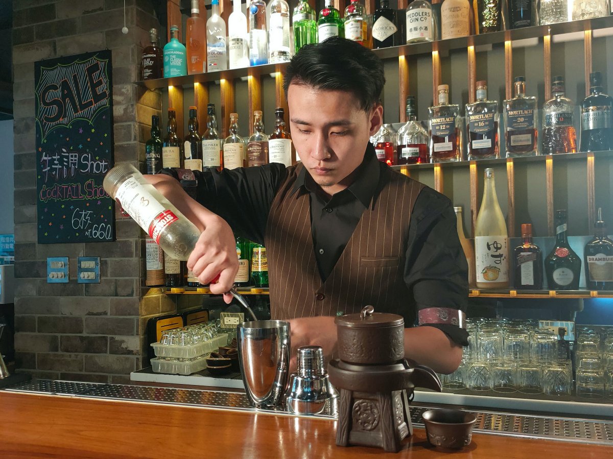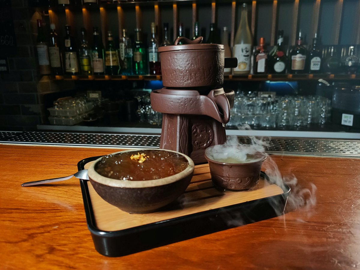 這杯「Fullhouse VIP昊室桂客」喝起來有著青蘋檸檬的果香、綠茶的甘澀,基酒是香甜的蘭姆酒,酸甜清爽的口感超適合女孩~最特別的是一旁特製的威士忌桂花凍,喝一口調酒再吃一口桂花凍,香氣四溢的桂花凍和香甜不膩的調酒在口裡激盪出不同的層次口感,三兩下一杯就被喝完啦~