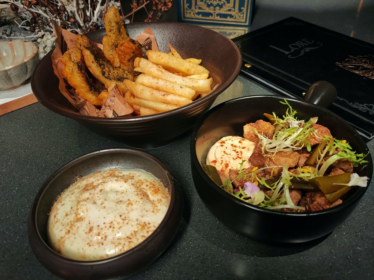 不可錯過的還有店內的餐點,像是這盤非常刷嘴的「鹽麴豬梅花佐豆腐乳醬」就是妞編輯的最愛,口感十足的豬梅花配上新鮮生菜,一旁的剝皮辣椒和自製豆腐乳大蒜美奶滋醬更是畫龍點睛!另一道推薦的餐點是「炸魚薯條」,使用啤酒麵糊做的炸魚,撒上了羅勒粉,更搭配了龍蒿醋、辣根製作的泡沫醬料,最終再撒上薑粉,那個醬料真的有點衝擊,大家要小心沾喔。